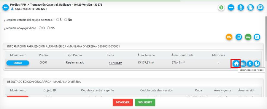 Si se presenta inconsistencia en la conciliación geográfica, se ejecutará la actividad llamada CONCILIAR GEOGRÁFICO, la cual será asignada al mismo usuario que realizó la respectiva edición geográfica.