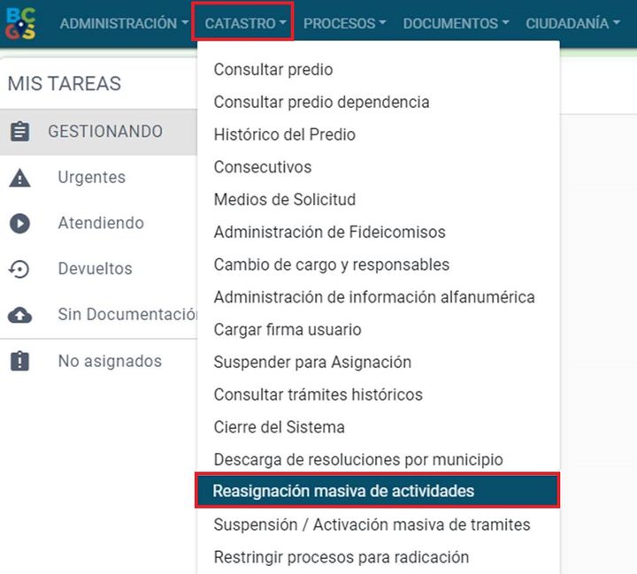 • Haga clic en el ítem de menú CATASTRO > REASIGNACIÓN MASIVA DE ACTIVIDADES.