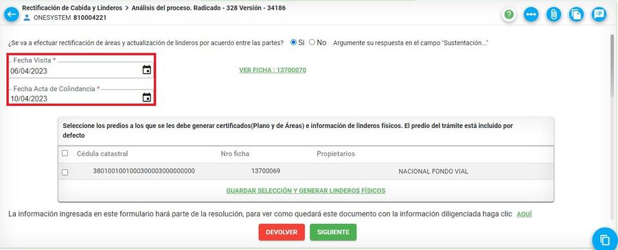 Ingresar la Fecha de la visita y la Fecha del acta de colindancia