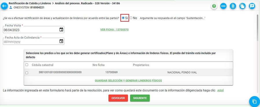 Luego clic sobre el enlace GUARDAR SELECCION Y GENERAR LINDEROS FISICOS
