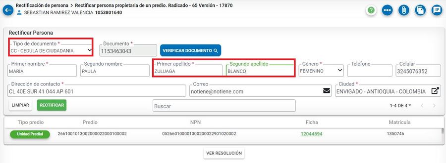 Seleccione Rectificación y escoja el tramite llamado Rectificación de persona
